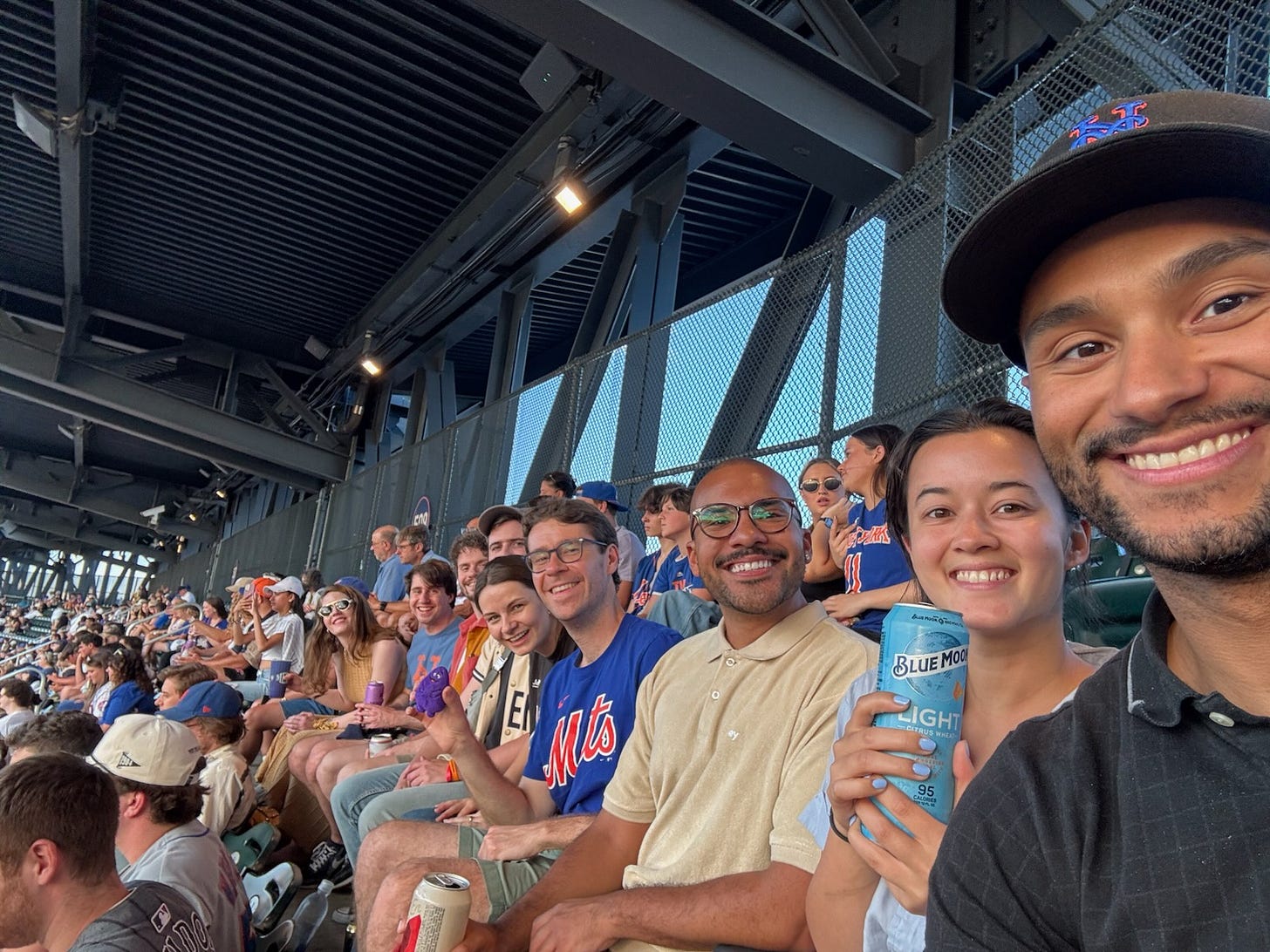 Meeting the Mets: Just a turn of phrase (we did not personally meet any Mets), but we did go to a game at Citi Field with a big group of friends, and it was Kathi’s first baseball game! I am annoyed that I already used the word vertiginous because we were perched at the very top row of the 500 section, watching the airplanes take off from LaGuardia Airport and feeling the cool breeze blowing at our backs. Jaime and Claire braved an impossibly long line to procure hot dogs and beer (it was $5 beer and hot dog night) and Kathi got to see the Mets eke out a nailbiter 3-2 victory (of course, I was in the line for my own drinks for the most exicting moment of the game when Francisco Alvarez hit a two-run homer).6