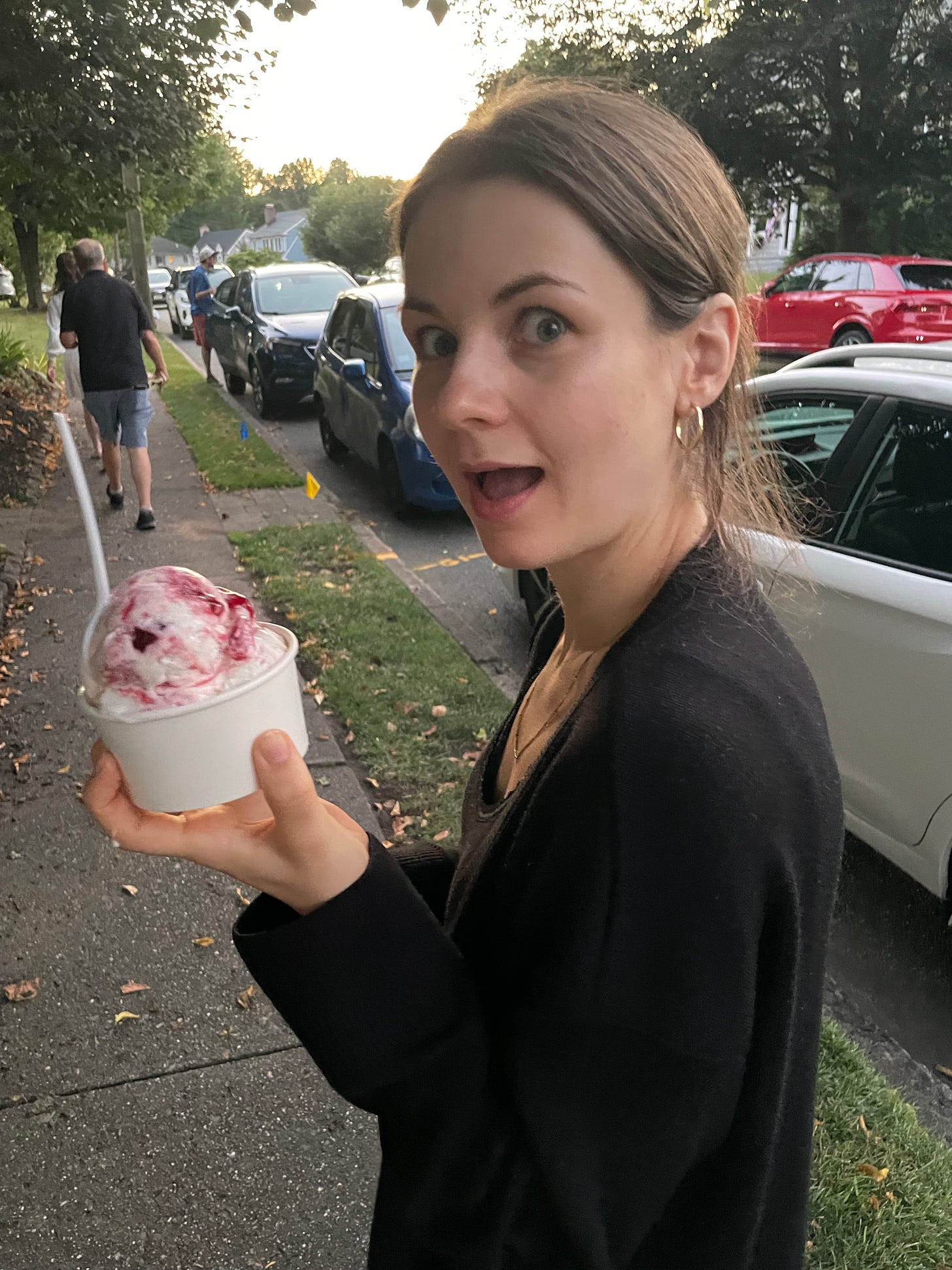 Van Dyke’s ice cream: Ridgewood is a town that, due to exorbitant rents and greedy landlords, experiences a high rate of business turnover. Van Dyke’s is an exception. Perhaps because it sits outside of downtown proper, or possibly because its ice cream is just that damn good. What is certain is that it has remained a constant throughout my life, right down to the refrigerator that stands at the entrance with the same 1990s logo of assorted refreshments still emblazoned on it. I had my go-to, peanut butter vanilla, and Kathi had raspberry. Here, as in many other places, we encountered American portion sizes and, despite it being evident that a “small” does not require three hefty scoops, nor is it necessary to turn down the request of a “half scoop” when still paying full price, Kathi got what would likely be considered a large ice cream anywhere else in the world in a “small” cup.