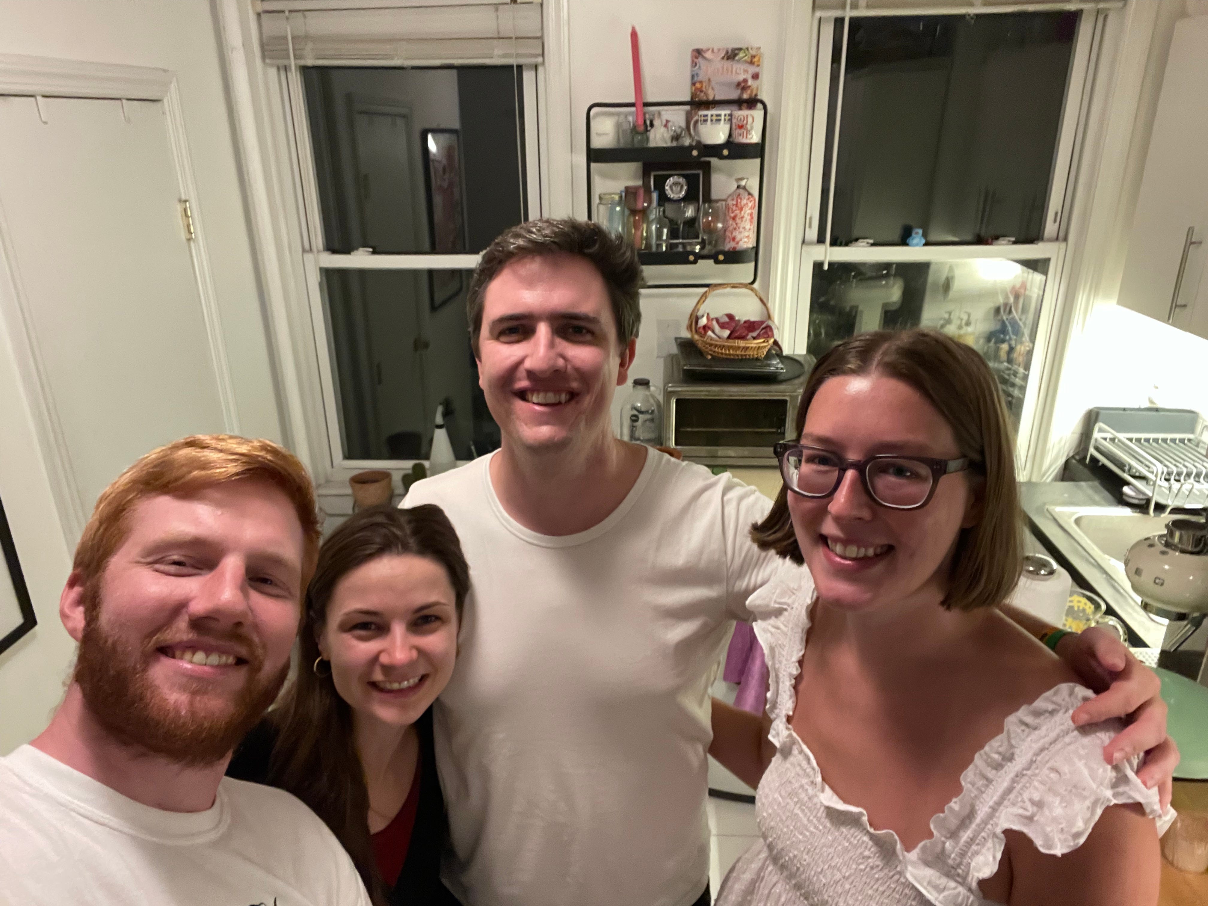 Game night with cuz: We picked up an upside-down Sicilian from Rosa’s, but not before being drenched by a torrential downpour that dogged us on our scamper back from Whole Foods, and headed to my cousin Sean’s apartment for an evening with him, his wonderful wife Mallory, and their sweet and shy doggo Moxie. We played Codenames, caught up, reminisced about old times, and took some Polaroid pictures — in the process capturing how Sean, Mallory, and I tower over Kathi.